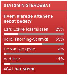 På Politiken.dk vinder Helle Thorning-Schmidt med næsten 2/3 af alle stemmerne, hvor at knap 1/4 mener at Lars Løkke Rasmussen klarede sig bedst. Hvis det står til Politikens netlæsere, er der altså ingen tvivl om, at det var Helle der klarede sig bedst. 4041 havde afgivet deres stemme da jeg tjekkede.