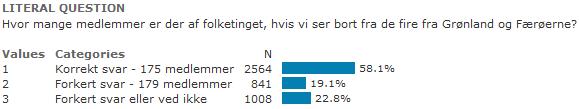 Respondenterne skal også besvare en række vidensspørgsmål, herunder blandt andet hvor mange medlemmer der er i folketinget, hvis man ser bort fra de nordatlantiske mandater. 41,9 pct. ved det ikke.