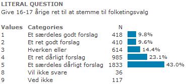 Under en femtedel af de adspurgte unge mener, at det er en god idé at sænke valgretsalderen. Over dobbelt så mange mener at det er et særdeles dårligt forslag. Det bliver spændende at se hvordan DUF sælger den.