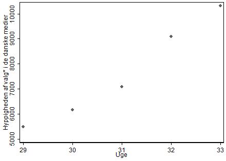 Ovenstående simple punktdiagram viser hvor mange gange der er skrevet om valg i de danske medier over de seneste uger. I uge 29 blev valg* nævnt 5.492 gange, i uge 33 10.320 gange.