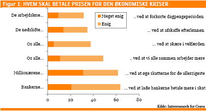 På den første side i analysenotatet finder vi figur 1, der viser svarene på: ”Hvem skal betale prisen for den økonomiske kriser [sic]”. Her skal respondenterne blandt andet svare på om de synes, at det er de arbejdsløse og/eller de nedslidte, der skal »betale for krisen«. Dette er der – knap så overraskende – ikke så mange, der synes om. Meget bedre ser det ikke ud i forhold til ønsket om at alle skal betale ved at skære i velfærden eller arbejde mere.