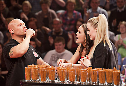 Det kan være alverdens forskellige opgaver kvinden kastes ud i. For eksempel at tage 60 armstrækkere på halvandet minut, flytte en masse slanger eller spise en helvedes masse saltstænger på meget kort tid.