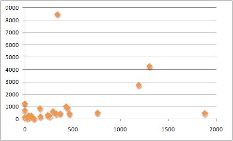 Figur 1: Y-aksen: Antallet af followers. X-aksen: Antallet af tweets Langt størstedelen af de danske politikere har under 1000 followers, hvilket nok bare siger noget om, at twitter ikke er ret udbredt i Danmark. Ligeledes kan vi observere, at langt de fleste politikere har skrevet under 500 tweets. Anne Marie Geisler Andersen fra Det Radikale Venstre er - med sine i skrivende stund 1882 tweets (damn, nu 1883!) og 458 followers - et eksempel på, at mange tweets ikke giver tilsvarende mange følgere. Margrethe Vestager og Ida Auken er omvendt de to brugere der har formået at have et højt aktivitetsniveau og ligeledes få en stor andel followers målt i forhold til den gennemsnitlige politiker på twitter. Det er muligt, at jeg i ovennævnte helt har set bort fra visse danske politikere, som har flere followers end de nævnte. Er du bekendt med danske politikere der har flere followers, og derfor hører til på listen, så skriv gerne en kommentar.