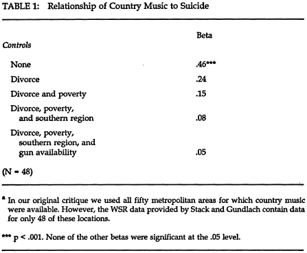 Som det reagerer Stack og Gundlach (( Stack, S. & J. Gundlach (1995). "Country Music and Suicide - Individual, Indirect, and Interaction Effects: A Reply to Snipesand Maguire", Social Forces 74(1): 331-335. )) på resultaterne ved at påvise simple korrelationer på individniveau mellem om man er fan af countrymusik og har været skilt eller separeret, og om man er fan af countrymusik og har et skydevåben, og konkluderer, at: »work is needed to explore the relationship between art and suicide, including country music.« (s. 335).