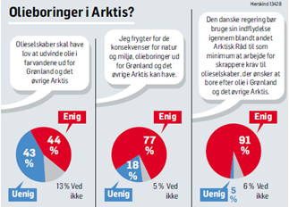 **Er danskerne enige med Greenpeace?**For det første er danskerne ikke nødvendigvis imod olieboringer. Artiklen i Politiken indledes med, at et ”flertal af den danske befolkning er skeptisk ved tanken om, at der skal bores efter olie i Arktis og i havet omkring Grønland”. Men meningsmålingen, der er foretaget af Epinion, viser, at 44 pct. af de adspurgte er enige i, at olieselskaber skal have lov at udvinde olie i farvandene ud for Grønland og det øvrige Arktis. 43 pct. er uenige. Ikke et flertal.