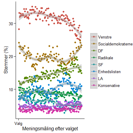 Venstre havde en stigning i meningsmålingerne efter valget, men er nu begyndt at falde. Dansk Folkeparti kan kun håbe at deres udviklingen i meningsmålingerne fortsætter som hidtil. Der er selvfølgelig også mulighed for at plotte udviklingen for flere partier i samme plot (foruden ggplot2 har jeg anvendt reshape2):