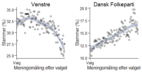 Efter at have lavet partivariablene numeriske, kan man bruge dem efter forgodtbefindende. For eksempel plotte hvordan de enkelte partier har rykket sig i meningsmålingerne siden Folketingsvalget. I disse to plot (lavet vha. ggplot2) er det vist for hhv. Venstre og Dansk Folkeparti:
