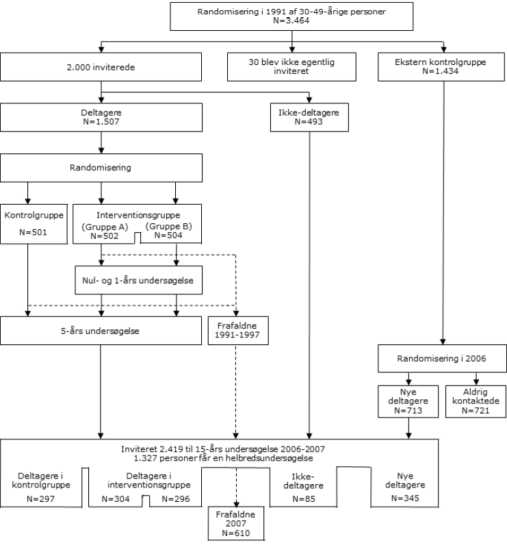 Der er tale om et kontrolleret felteksperiment, hvor en randomisering i 1991 af 30-49 årige personer er blevet inddelt i forskellige grupper (N=3.464). De 2.000 af dem blev inviteret til at deltage og ville få en undersøgelse. 1.434 fik ingen undersøgelse (de resterende 30 blev ”ikke egentlig inviteret”). De 2.000 invitererede blev delt i tre grupper: To interventionsgrupper og en kontrolgruppe. Begge interventionsgrupper blev tilbudt at deltage i helbredsundersøgelser efter 0 og 1 år (rapporten slår af samme grund disse to grupper sammen). Dette gjorde kontrolgruppen ikke. Nedenstående diagram viser fordelingen af de 3.464 forsøgspersoner: