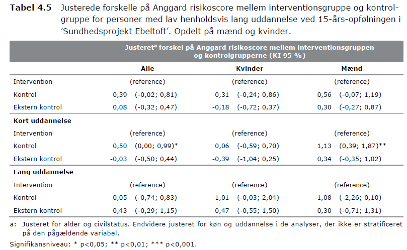 Det er så undersøgt, hvilke sundhedsforskelle der er mellem grupperne 15 år senere. Her er det relevant at tage fat i de sundhedseffekter, Nick Hækkerup har advokeret for. Forfatterne af rapporten argumenterer for på side 25, at efter ”justering for alder og civilstatus er Anggard risikoscoren for mænd med kort uddannelse signifikant højere i kontrol-gruppen end i interventionsgruppen, og Anggard risikoscoren er lavere i kontrolgruppen end i interventionsgruppen blandt mænd med lang uddannelse, hvilket dog ikke er statistisk signifikant (p=0.073).”
