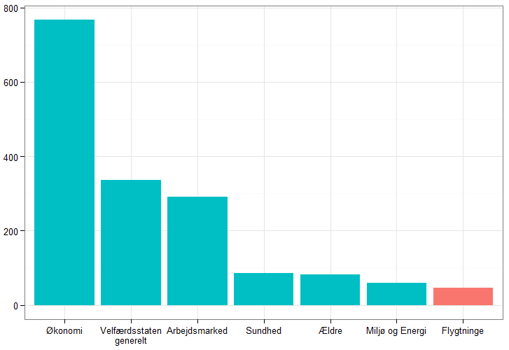 Ovenstående figur viser fordelingen af de mest relevante kategorier. På figuren kan det aflæses, at over 700 af respondenterne valgte problemer relateret til økonomien, over 300 valgte problemer relateret til velfærdsstaten, efterfulgt af arbejdsmarked, sundhed, ældre og miljø og energi. Vi skal et godt stykke ned, før vi finder indvandrere. Intet taler for, at indvandringen opfattes som det største problem blandt danskerne. Med mindre man selvfølgelig designer en undersøgelse, der har til hensigt at komme frem til den konklusion.