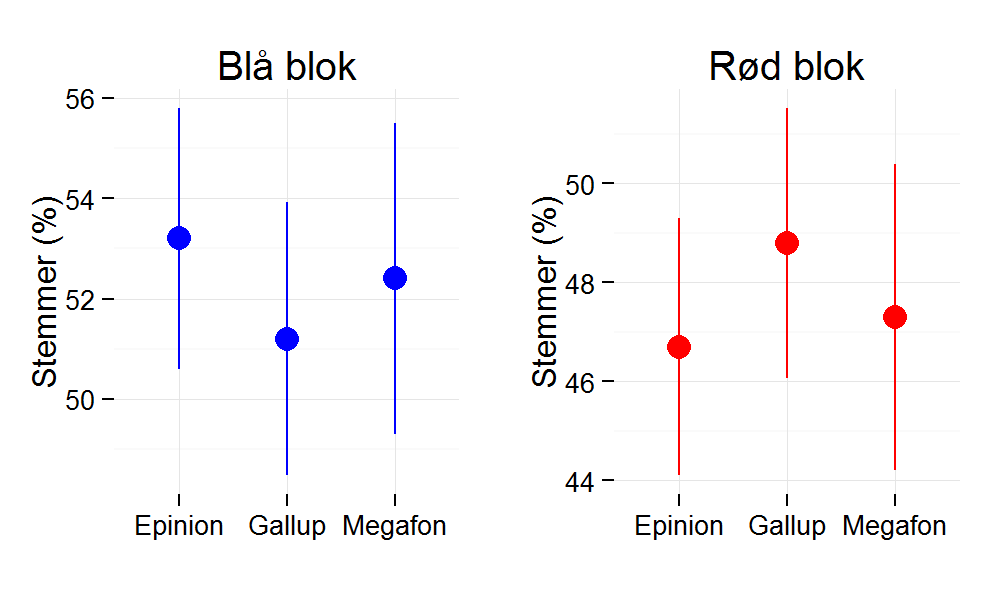 Figuren viser, at de tre meningsmålinger ligger meget tæt op ad hinanden. Faktisk ligger de så tæt, at der ikke er nogle partier, der står signifikant dårligere eller bedre i én måling i forhold til en anden måling. Når vi kigger på blokkene, hvor rød blok består af Socialdemokraterne, Radikale, SF, Enhedslisten og Alternativet, og blå blok af Venstre, Konservative, Dansk Folkeparti, Liberal Alliance og Kristendemokraterne, ser vi da heller ikke, at der er forskelle på tværs af målingerne.