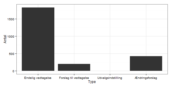 Langt de flete afsteninger i de åbne data vedrører afstemninger sendt til endelig vedtagelse og kun meget få vedrører udvalgsindstillinger. Vi kan også se nærmere på, om der er forskelle i hvilke typer af afstemninger der bliver vedtaget (hvilket der af meget logiske årsager er):