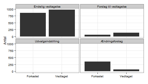 Som det kan ses bliver afstemninger omkring endelig vedtagelse oftere vedtaget end forkastet, hvor det modsatte er tilfældet for ændringsforslag. Ovenstående er ét eksempel på, hvordan man kan hente data ned og kombinere dem fra Folketingets åbne data, og der er givetvis mange forskellige måder at gøre dette på. Ligeledes er der flere forskellige sider at hente ned og kombinere på hjemmesiden, så bare fordi afstemninger ikke nødvendigvis er det mest interessante, betyder det ikke, at det ikke kan kombineres med andre spændende data. God fornøjelse.