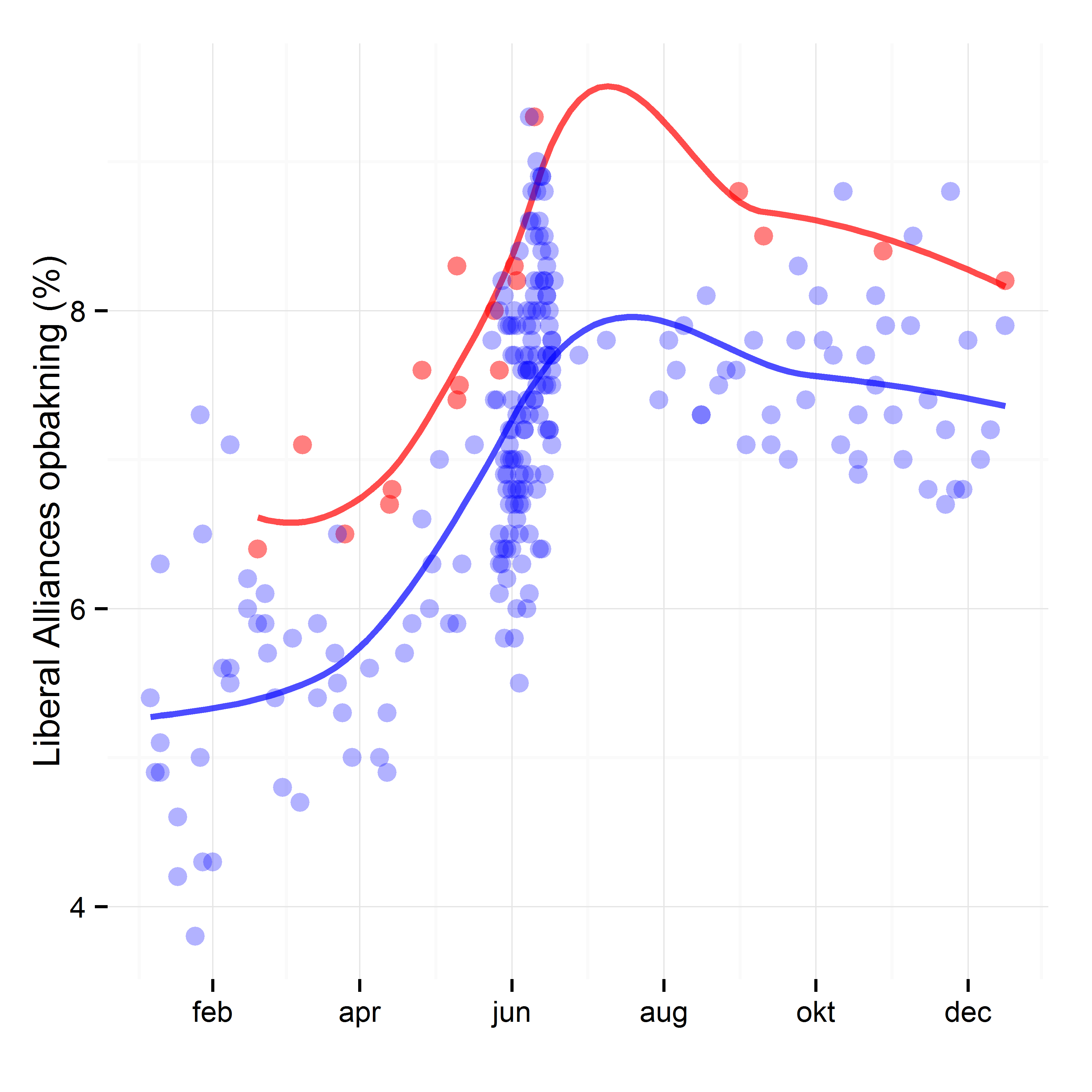 Nedenstående figur viser Liberal Alliances opbakning i meningsmålingerne i henholdsvis de meningsmålinger, der blive delt af Anders Samuelsen, og alle andre meningsmålinger. De røde punkter viser meningsmålinger, Anders Samuelsen har delt, hvor de blå punkter er meningsmålinger, der ikke er delt. Ikke så overraskende er der en tendens til, at det især er de meningsmålinger, hvor Liberal Alliance klarer sig godt, der bliver delt.