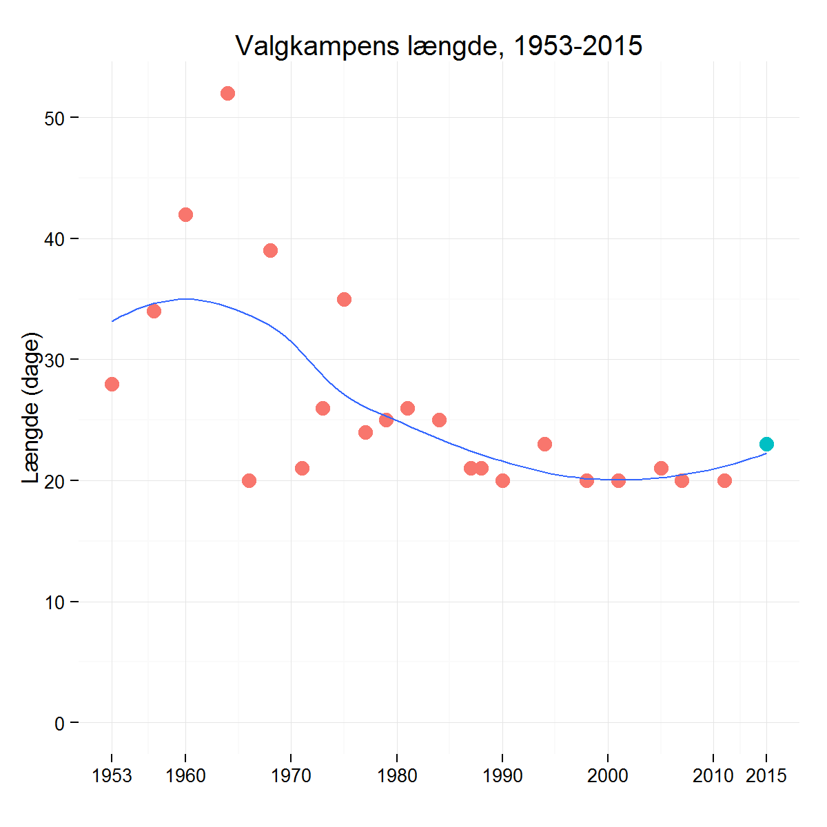 Sammenlignet med de seneste valgkampe får vi denne gang et par dages ekstra valgkamp (og, alt andet lige, nok et par debatter og mellem 5 til 10 meningsmålinger ekstra). Vi skal tilbage til valgkampen i 1994 for at finde en valgkamp med samme længde som ved folketingsvalget 2015. Kigger man på det storre billede kunne det dog være meget værre. Vi har således set eksempler på valgkampe der forløb over en hel måned.