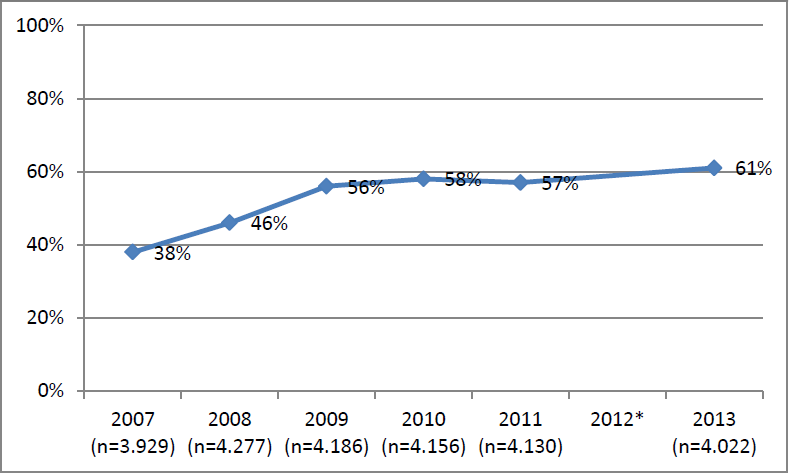 Først er det vigtigt at forstå konteksten for undersøgelsen. Kræftens Bekæmpelse står hvert år bag en undersøgelse, der undersøger danskernes holdninger til og viden om brugen af solarier. De tidligere år har de, med undtagelse af 2012, spurgt: ”Mener du, at det skal være forbudt for børn og unge under 18 år at gå i solarium?”. Her er en figur fra rapporten fra 2013, der viser udviklingen:
