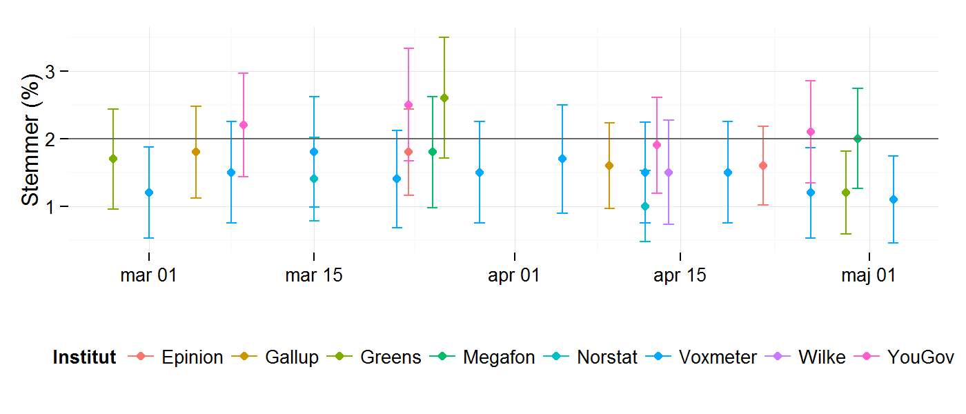 Problemet med meningsmålinger er dog, at de ofte er forbundet med en stor usikkerhed, hvorfor det er svært at drage konklusioner omkring partiernes udvikling i meningsmålingerne. Til trods for at Alternativet har en lille vælgertilslutning og dermed en mindre statistisk usikkerhed end de større partier, er det svært at konkludere noget, når de er i nærheden af to procent. Nedenstående figur viser de 26 meningsmålinger, der har inkluderet tal fra Alternativet, lige fra Greens Analyseinstitut for Børsen den 26. februar til Voxmeter for Ritzau den 3. maj.