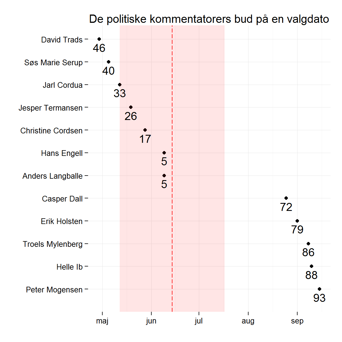 Nedenstående figur viser hvor langt de respektive politiske kommentatorer var fra at ramme rigtigt. Den røde, stiplede linje er den 18. juni, hvor der som bekendt skal være valg. Jo længere væk punktet er fra denne linje, desto mere tog den pågældende politiske kommentator fejl. Jeg har desuden tilføjet et rødt areal, der viser to standardafgivelser (en på hver side af valgdatoen).