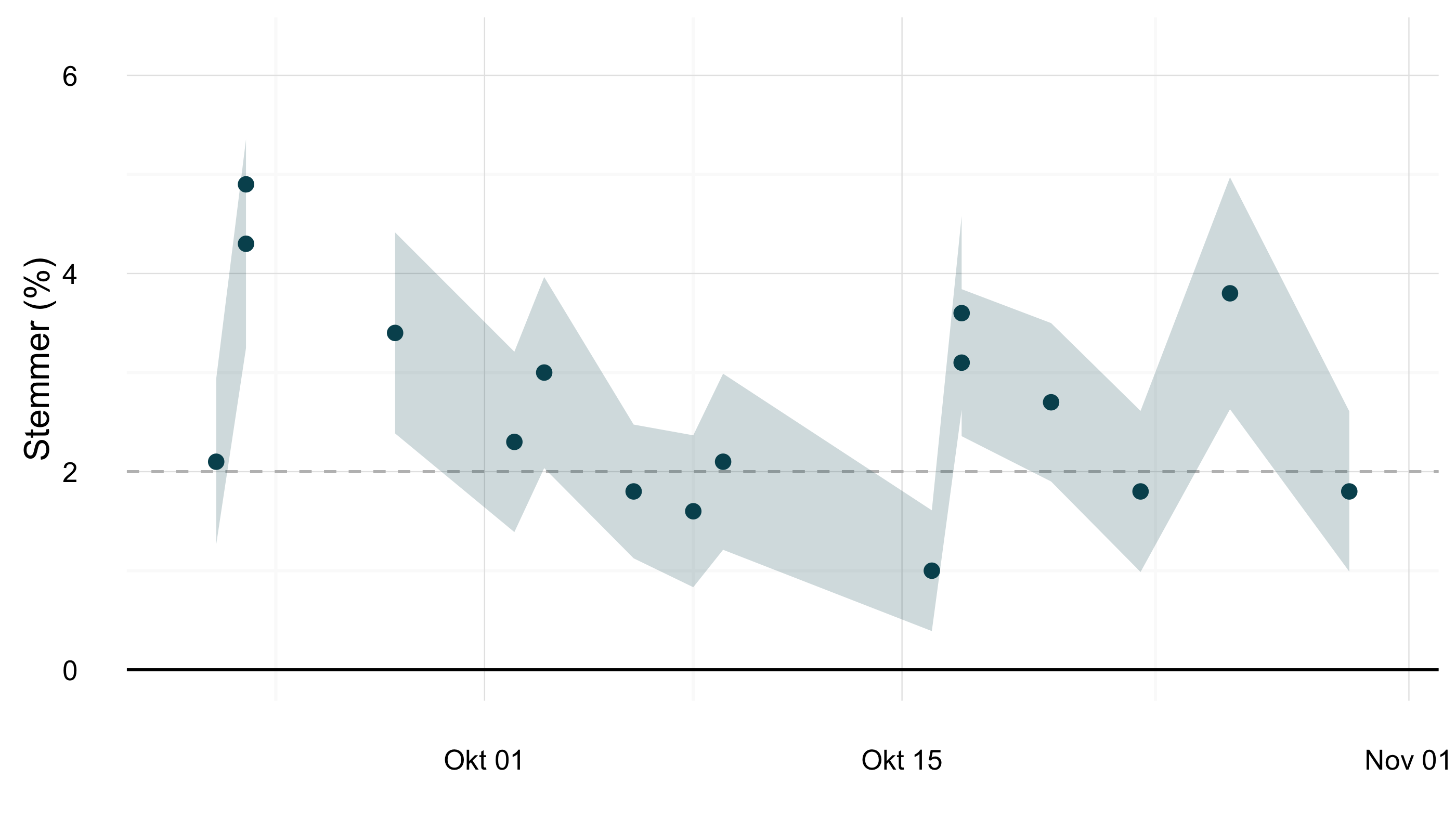 Vi har således også set, at der er kommet forskellige målinger med en større usikkerhed, end vi burde forvente, hvis vi bare havde tilfældig støj, som den statistiske usikkerhed er til for. Derfor har jeg også været utroligt skeptisk i forhold til ikke alene at tage enkeltmålingerne seriøst, men også de vægtede gennemsnit, der bygger på få enkeltmålinger. Et illustrativt eksempel er Altingets vægtede snit, der proklamerede "Snit af målinger: Medvind til Nye Borgerlige, men rød blok står til flertal". Det kedelige ved denne nyhed er, at det vægtede snit byggede på blot to af de meningsmålinger, der som bekendt begge blev indsamlet inden for det første døgn efter nyheden om, at partiet nu havde stemmer nok til at blive opstillingsberettiget.
