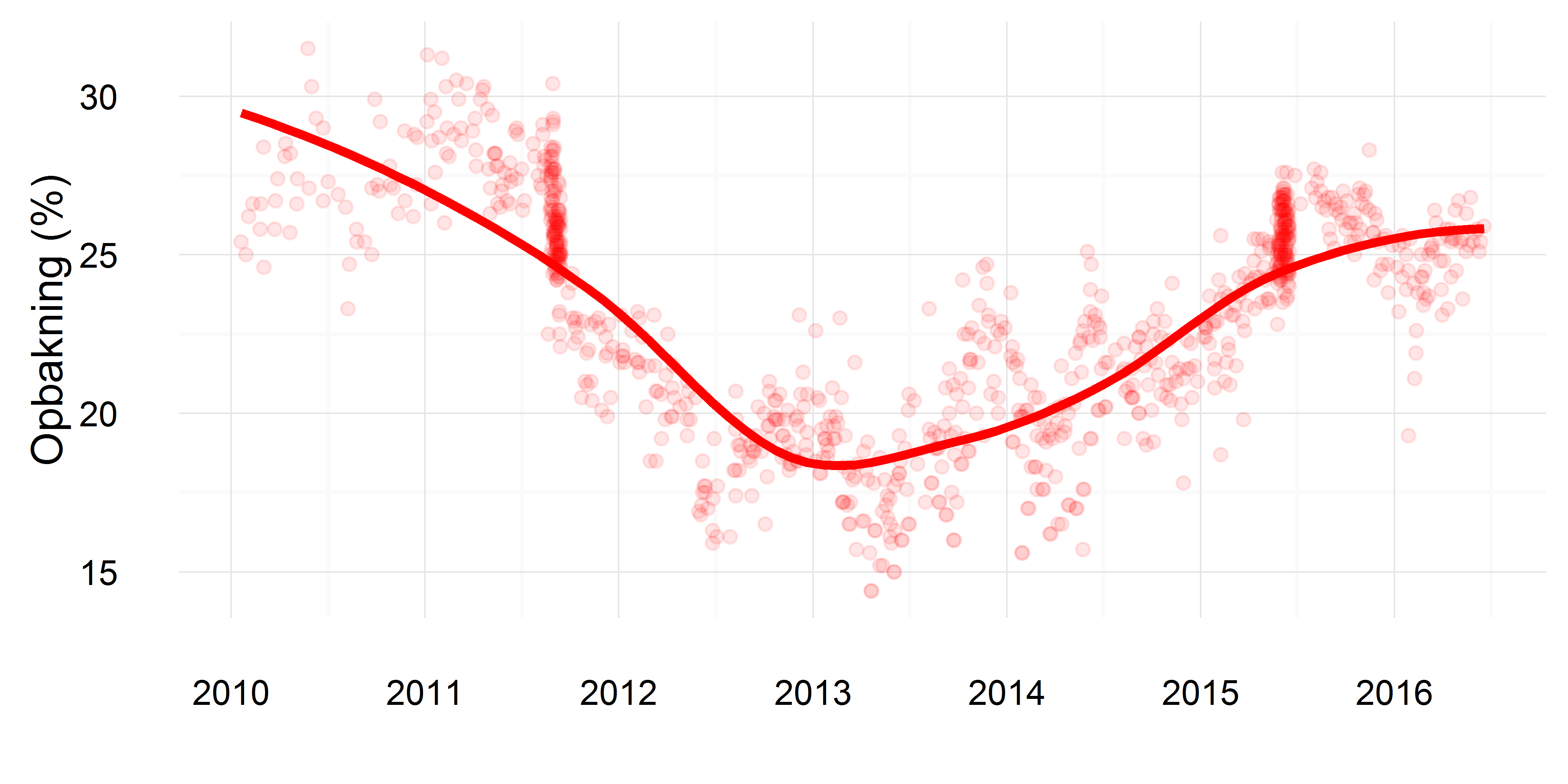 ggplot(polls, aes(x=as.Date(date), y=party\_a )) + geom\_point(col="red", alpha=.1) + geom\_smooth(col="red", se=F, alpha=.5, size=1.2, span=.65) + theme\_minimal() + ylab("Opbakning (%)") + xlab("")