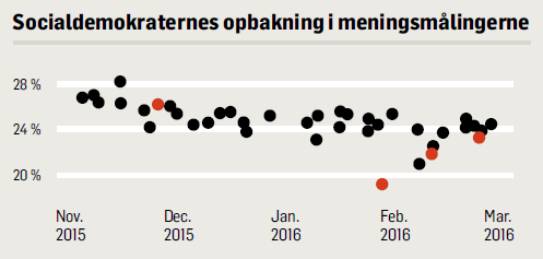 Siden da har vi set endnu en måling fra Megafon, der viser, at Socialdemokraterne ligger på omkring de 24 procent, som de har gjort i flere måneder. Det samme mønster, bare uden en ekstrem måling, finder man i hos de andre analyseinstitutter. I lørdags (den 5. marts) havde jeg derfor en analyse i Politiken, der inkluderede nedenstående figur: