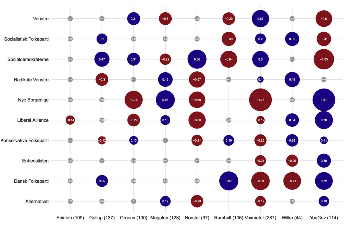 In an analysis of all Danish opinion polls on the public support for political parties from 2010 to 2017 (n=1,062), Zoltán Fazekas and I examined whether such house effects are present for the national political parties. In doing this, we relied on the Bayesian approach described in Jackman (2005) to estimate house effects for each of the 10 parties (90 estimates in total given the 9 polling firms).