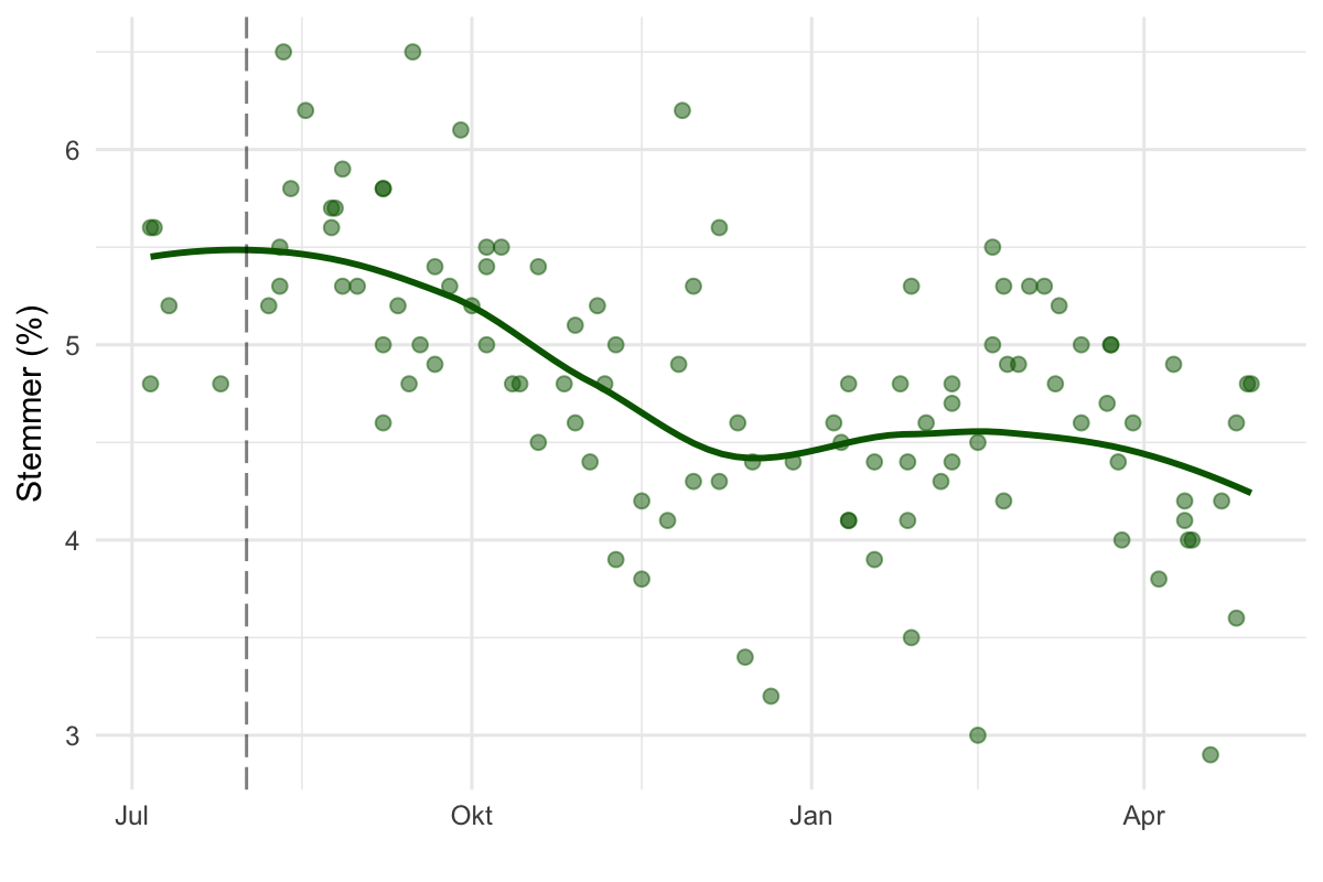 Hvor stor var denne Pape-effekt? Figur 1 viser hvordan det gik de Konservative i meningsmålingerne, efter Søren Pape tiltrådte som ny formand for partiet. Den stiplede linje i figuren angiver tiltrædelsesdatoen. Overordnet betragtet er det ikke til at se, at der har været en klar og synlig positiv effekt af, at Søren Pape tiltrådte som partileder.