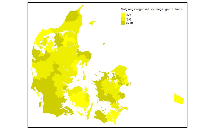 I modellen blev det forudset, at Dansk Folkeparti ville gå frem i alle 98 kommuner. I ikke så meget som én kommune ville partiet få et dårligere valg end i 2013. Figuren der bedst illustrerede dette kan ses her: