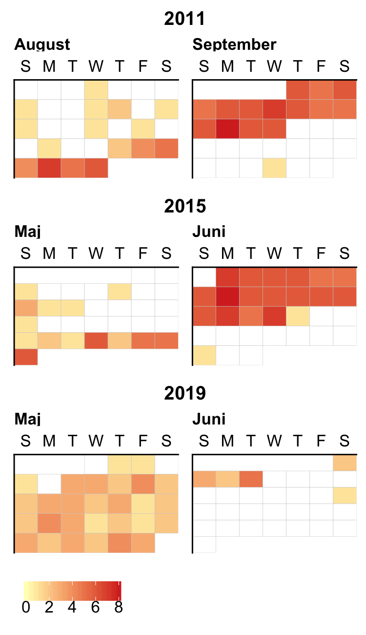 Her kigger jeg på de tre seneste folketingsvalg, hvor jeg har fyldestgørende data: 2011, 2015 og 2019. I Figur 1 vises de dage, der dækker de respektive valgkampe i 2011, 2015 og 2019, samt antallet af meningsmålinger for hver dag.