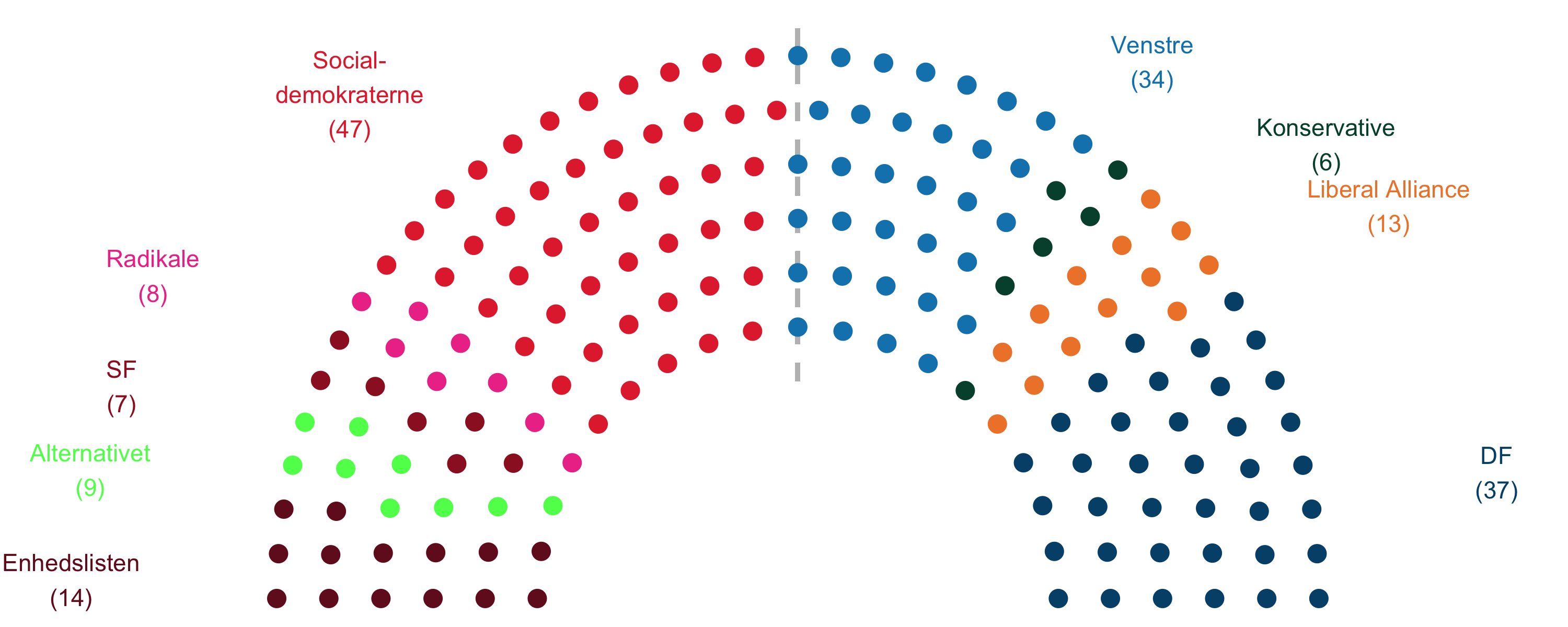 Figur 1 viser partiernes størrelsesforhold efter 2015-valget i mandater. Dansk Folkeparti med hele 37 mandater ligger solidt ude til højre og mestrer det store flertal i den blå lejr. Liberal Alliance klarede sig ganske fint, og de Konservative oplevede endnu et dårligt valg. På venstrefløjen var det interessante, foruden Socialdemokraternes fremgang, at et nyt parti, Alternativet, blev valgt ind med 9 mandater.