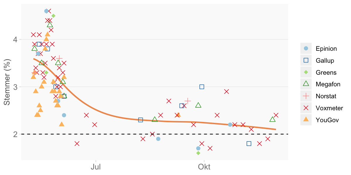 For det andet er Liberal Alliance ikke faldet ned under spærregrænsen for nyligt. Partiet har ligget relativt stabilt omkring spærregrænsen siden valget uden tydelige indikationer på en udvikling. Nedenstående figur fra Politologi.dk viser faldet i opbakning efter valget, der ikke er en ny udvikling.