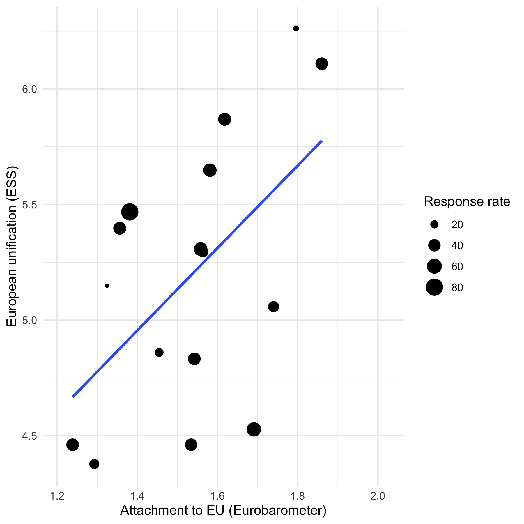 The size of each dot is the response rate (with a greater size indicating a greater response rate). We see a strong correlation between the estimates in the two surveys. In countries where more people feel attached to the EU (in Eurobarometer), more people are also more likely to prefer European unification (in the European Social Survey).