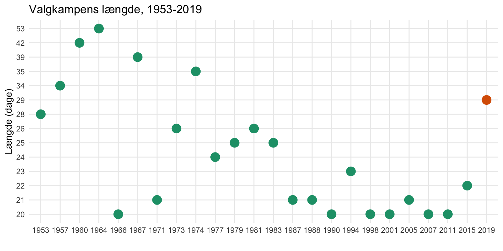 I ovenstående figur ser vi, at vi skal et godt stykke tilbage i tid, før vi finder en mindst lige så lang valgkamp. Helt specifikt skal vi tilbage til 1974, hvor valgkampen varede 35 dage.