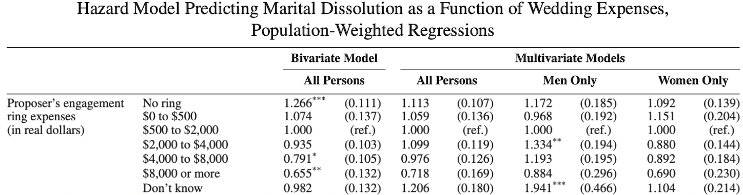 There is a lot of stuff going on in the text above. The first problem is that bivariate models actually suggest the opposite of what the authors argue in the paper. The consistent finding in a bivariate model is that people engaged with no engagement ring are significantly more likely to be divorced. And people with an expensive engagement ring are more likely to stay married.