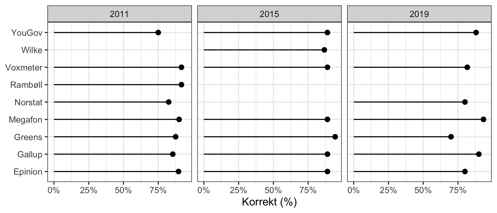 I 15 ud af 27 tilfælde - når vi kigger på partiene (vist i ovenstående figur) - ramte alle meningsmålinger korrekt (altså 100%). 21 ud af 27 partier blev ramt rigtigt i omkring eller mere end 95% af gangene.