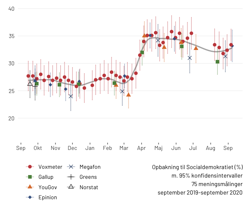 Her kan vi se, at der var en stor stigning i opbakningen til Socialdemokratiet i løbet af marts. Siden da har opbakningen ligget stabilt på omkring 33 pct., med nogle meningsmålinger højere og andre målinger lavere. Vi har fået to meningsmålinger i denne uge, hvor Socialdemokratiet ligger på hhv. 33,4 pct. (Voxmeter) og 33,2 pct. (Epinion). Tager vi den statistiske usikkerhed i betragtning, er det svært at se et mønster, der viser nogen forandring, siden Socialdemokratiets opbakning steg.