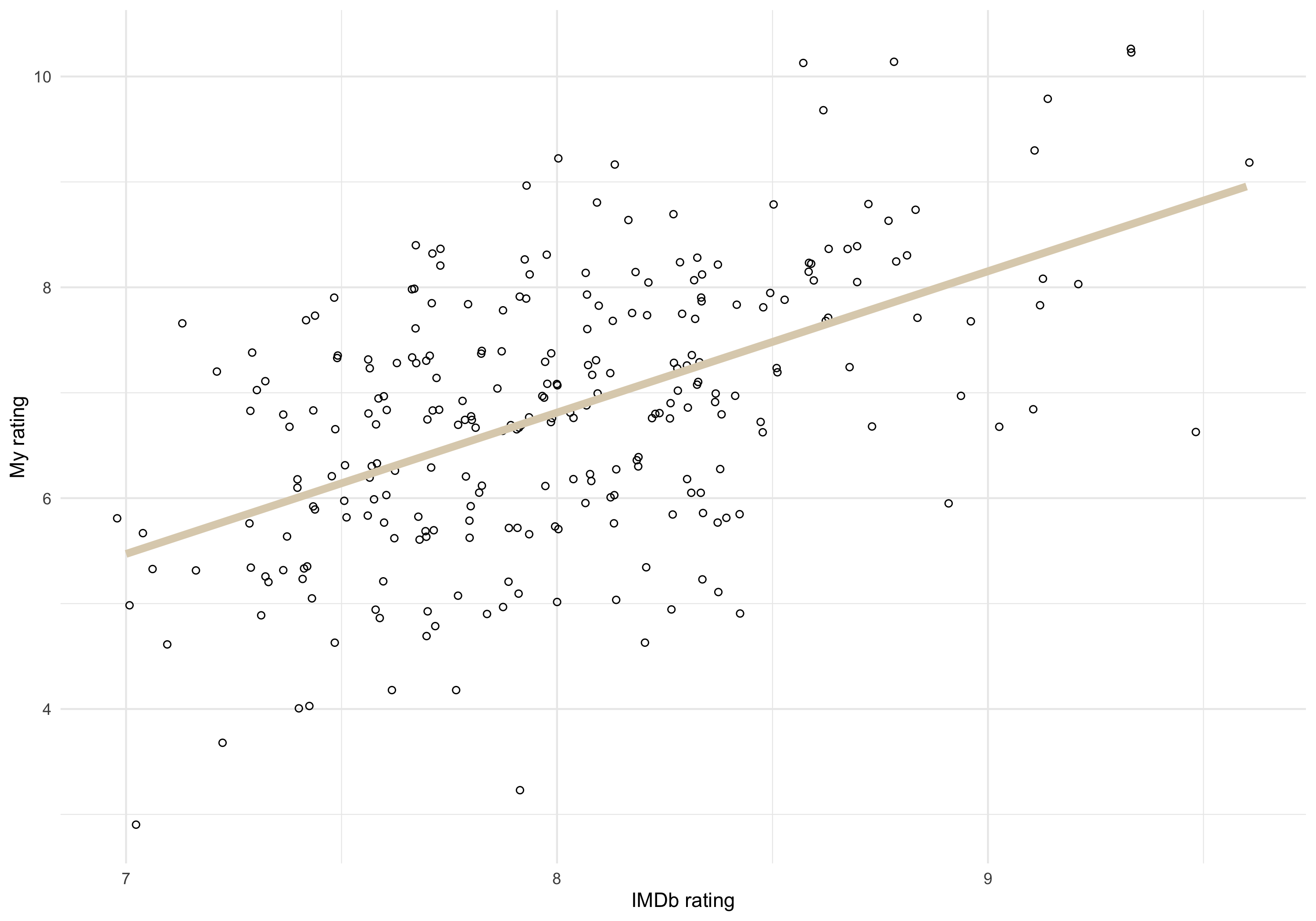 27% of the variation in my ratings can be explained by the IMDb score (R² = .27). In an OLS regression, adding the date of the airing of the episode, number of votes and a set of binary variables with the director of the episode adds little extra explanatory power to the model (adjusted R² = .32).