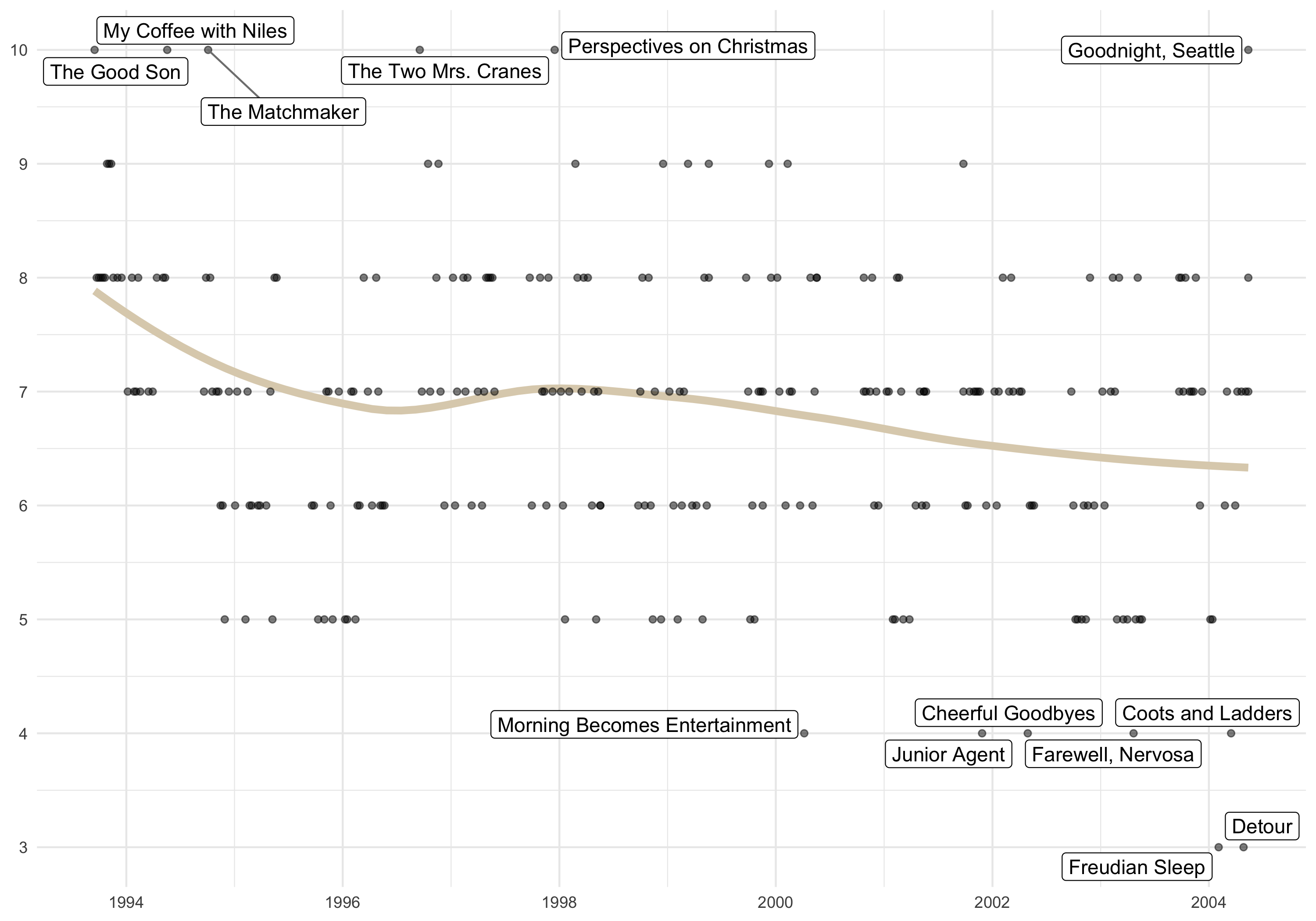 What I noticed the second time I watched the show (or at least thought more about this time), is how much it is always about the internal dynamics between the characters and in particular what they know or misunderstand or misremember or lie about. And how that - at the end of the day - never plays out well for Frasier. Unsurprisingly, some of the best episodes rely on the consequences of asymmetrical information (e.g. The Matchmaker and Two Misses Crane).