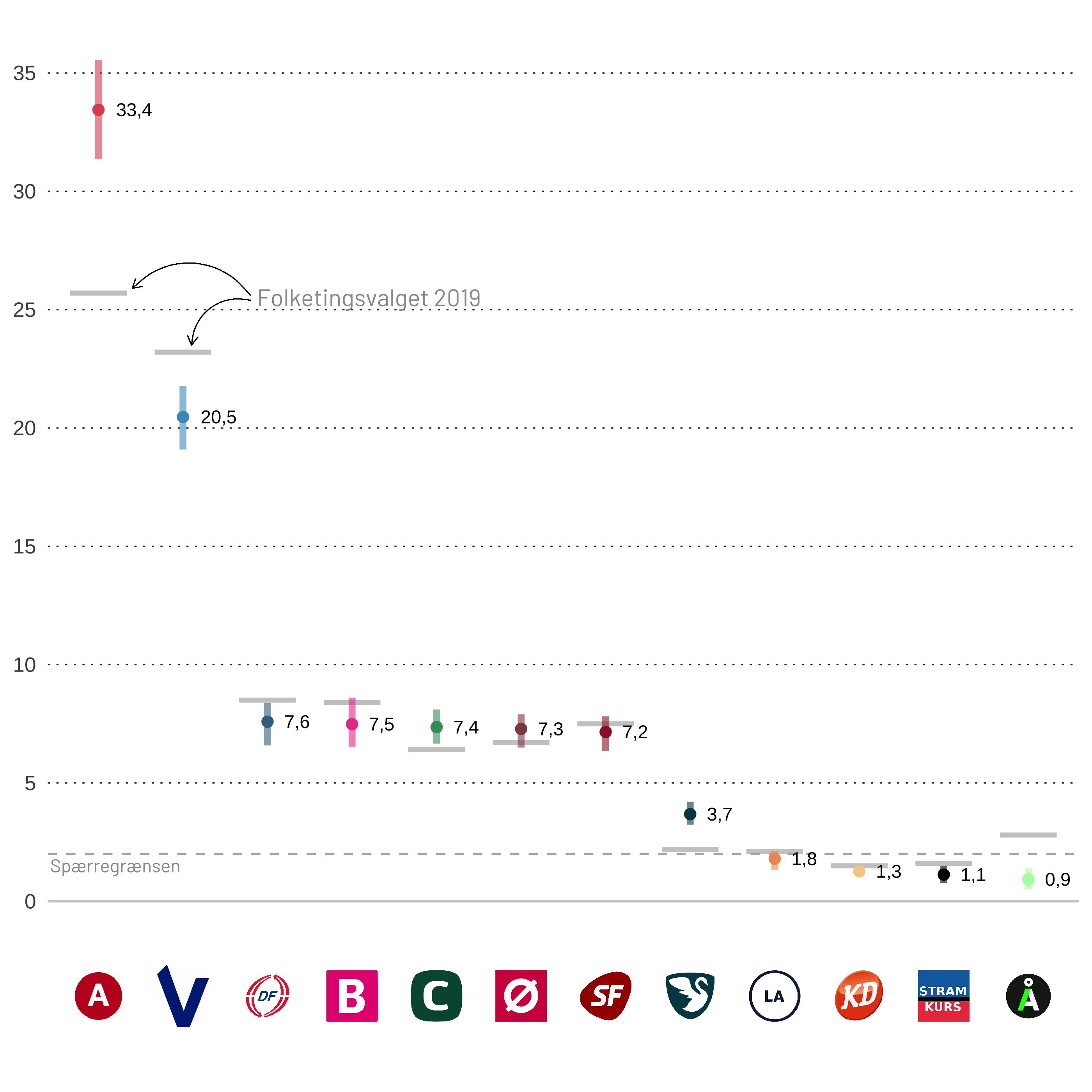 På den ene side har vi meningsmålingerne fra især Voxmeter, der har placeret partiet omkring spærregrænsen. På den anden side har vi meningsmålinger, primært fra YouGov, der har placeret partiet tættere på 5% end 2%. Folketingsvalget i 2019 viste, at YouGov tog fejl - og de fleste andre analyseinstitutter var mere præcise.