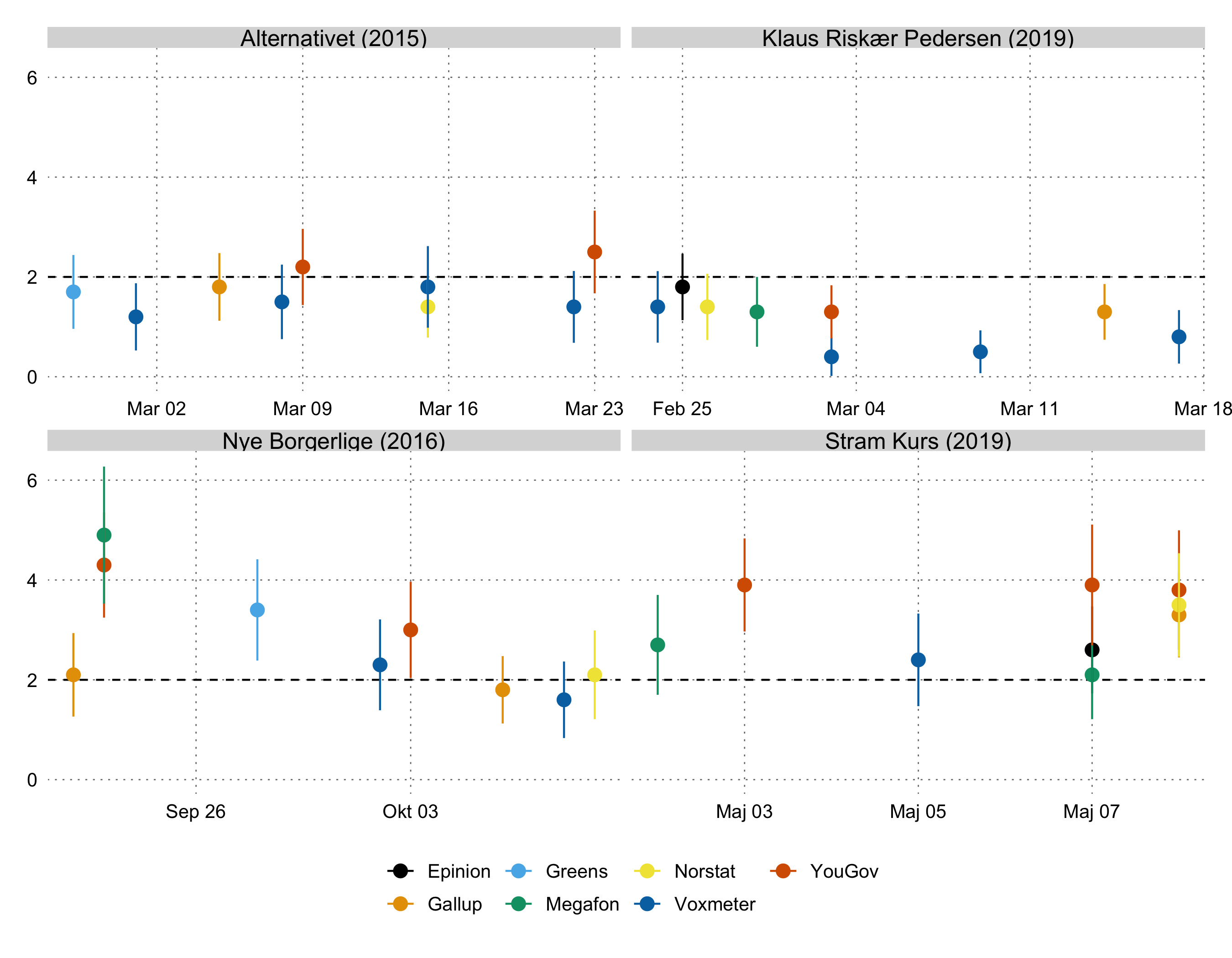 For det andet ligger partiet lavere end hvad meningsmålingerne har vist ved andre nye partier, der er stillet op til valg i løbet af de senere år. Her kan vi kigge på Alternativet, Nye Borgerlige, Klaus Riskær Pedersen, og Stram Kurs. Konkret ser vi her på hvad de første meningsmålinger viste for disse partier: