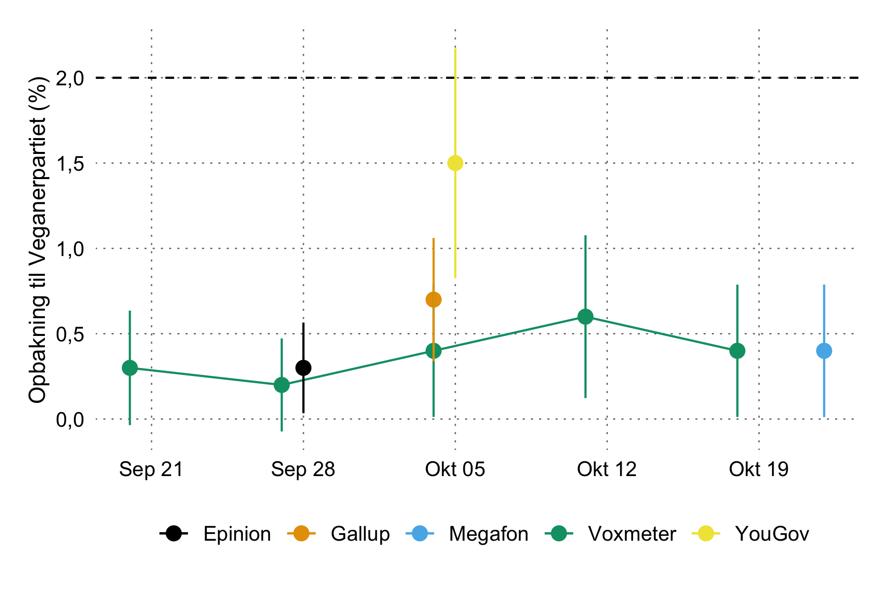 De fleste analyseinstitutter (Voxmeter, Epinion, Gallup og Megafon) vurderer, at Veganerpartiet står til at få omkring 0,5% af stemmerne. YouGov er vanen tro vores outlier her, der giver partiet 1,5% af stemmerne og udelukker dermed ikke, at partiets reelle opbakning kan være omkring 2% (og dermed over spærregrænsen).