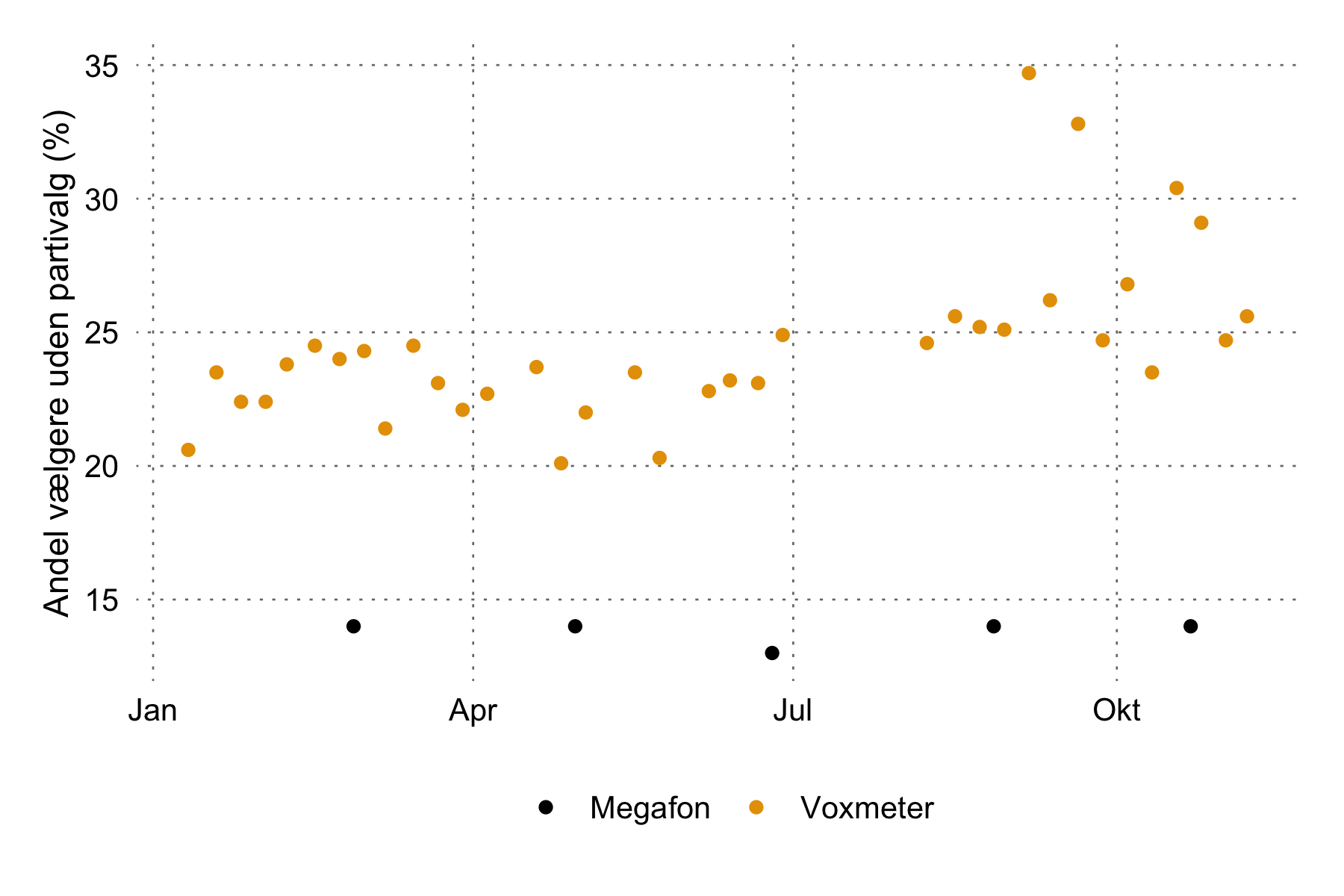 Der kan være forskellige grunde til disse forskelle. For det første er det muligt, at Megafon gør mere for at presse et partivalg ud af deres respondenter (og eksempelvis gør mere for at respondenterne ikke kan vælge, at de vil stemme blankt). For det andet kan det skyldes metodiske forskelle i, hvordan respondenter udvælges og interviewes (via telefon eller over nettet). Det mest interessante er dog hvor begrænset variation der er hos Megafon, hvor andelen af respondenter uden et partivalg er noget nær konstant. Dette forekommer meget mystisk, da der også burde være usikkerhed omkring disse estimater. Variationen vi finder hos Voxmeter ser betydeligt bedre ud.