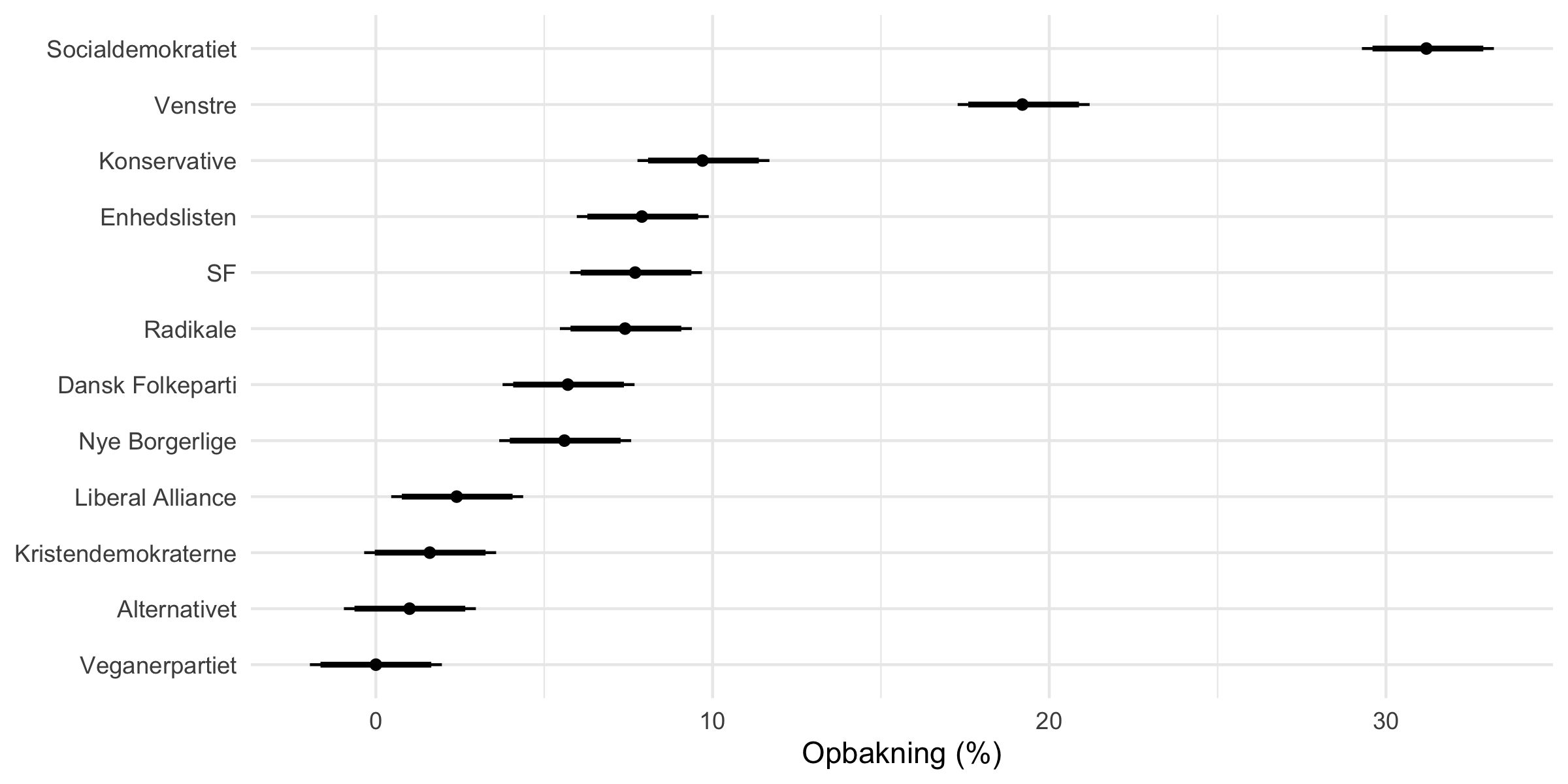 Dette vil især egne sig godt til en visuel formidling, hvis man kan vise et estimat med den statistiske usikkerhed som en fleksibel størrelse. Et bud er således at give både 95% og 90% konfidensintervaller. Her er et visuelt eksempel med den seneste meningsmåling fra Voxmeter: