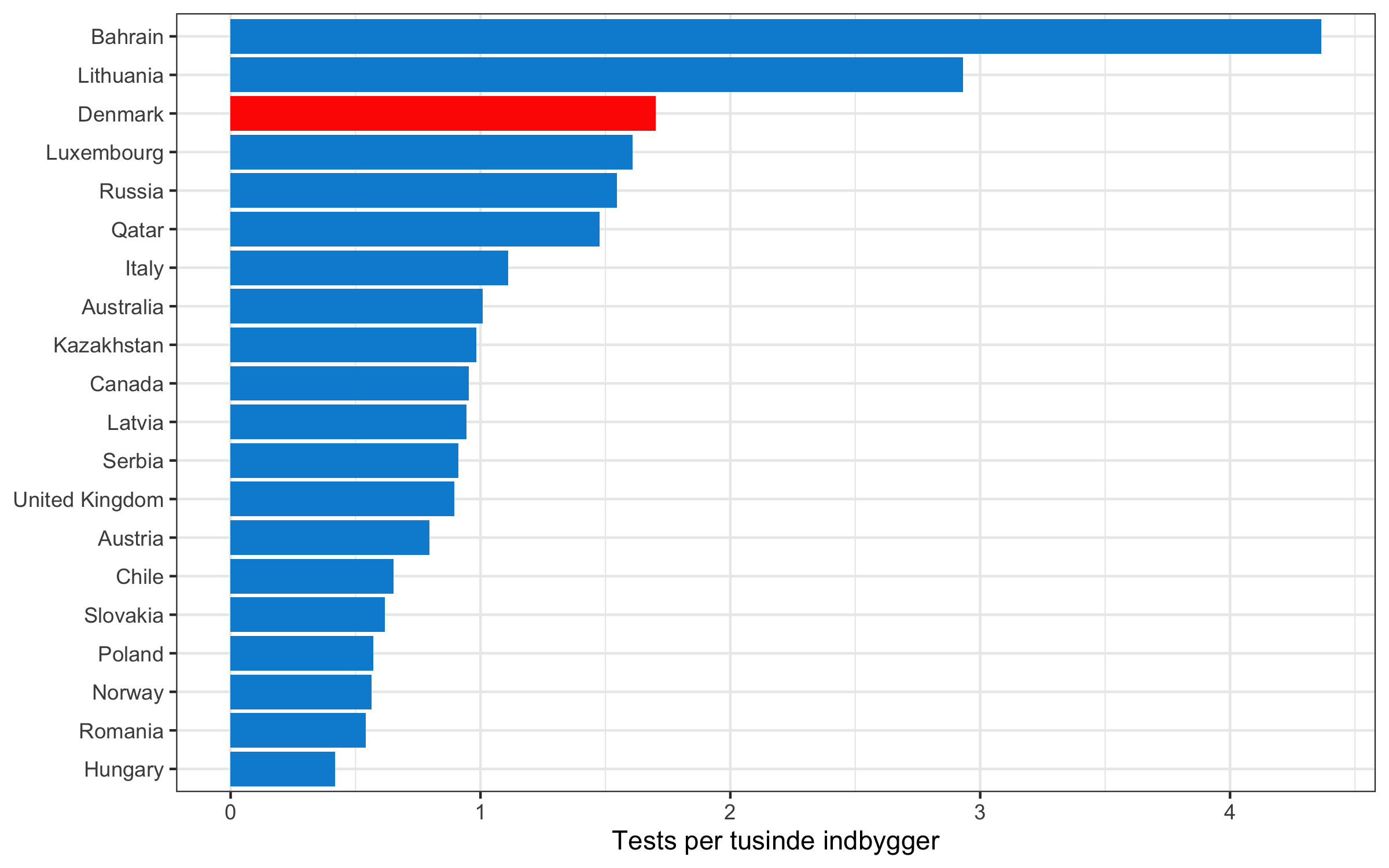 For det første har regeringen været yderst selektiv i forhold til, hvilke lande, der vises data fra. Jeg har taget data fra den datakilde, regeringen anveder. Nedenstående figur viser de 20 lande, der foretager flest tests.