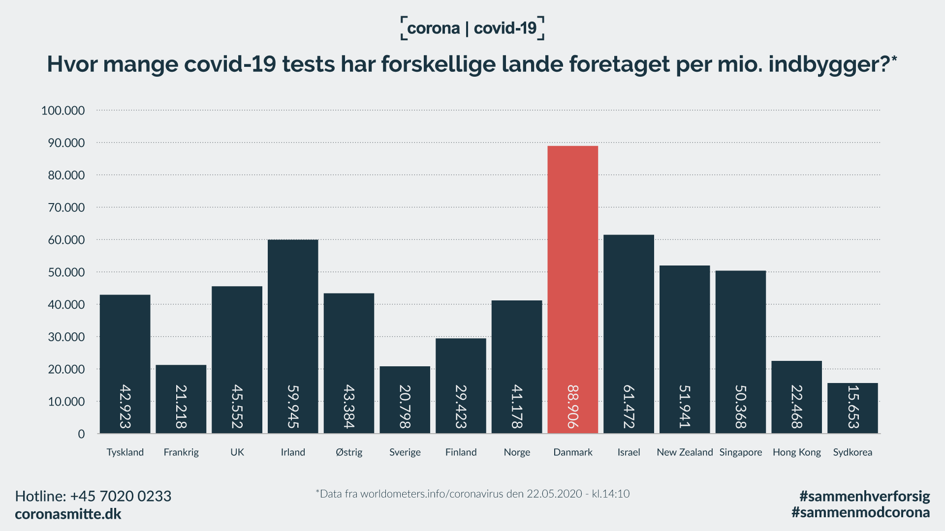 Den danske regering træffer mange vigtige beslutninger i disse dage. Jeg er bekymret for, om de træffer beslutninger på det bedst oplyste grundlag. Tag denne figur (fra 22. maj), hvor regeringen oplyser, hvor mange tests der foretages i forskellige lande:
