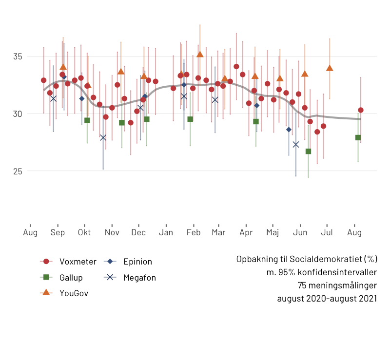 Det er sandsynligt at opbakningen ikke vil forblive så høj, som den er nu, men der er i min optik intet der taler for, at der er sket noget nyt i meningsmålingerne, når vi kigger på Socialdemokratiet. Min vurdering er, at der skal mere til, før at Socialdemokratiet falder i målingerne, end hvad vi har set nu, men dette udelukker selvfølgelig ikke, at partiets opbakning kan blive mindre (eller større) i fremtiden.