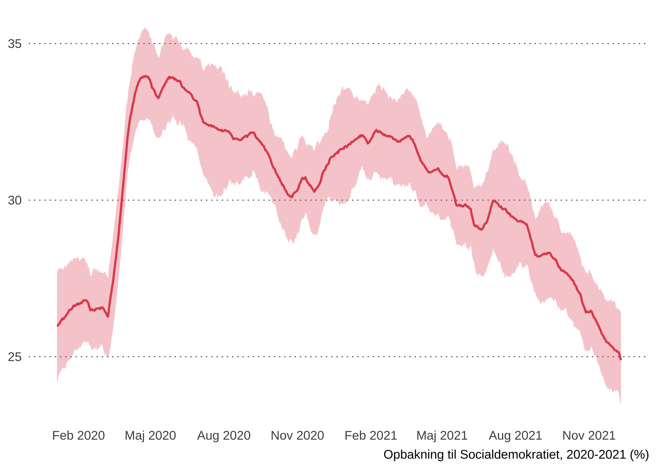 Vi ser som bekendt at Socialdemokratiet oplevede en stor fremgang i meningsmålingerne ovenpå den første coronanedlukning i begyndelsen af 2020. Derefter lå partiet relativt stabilt på den gode side af 30%, men fra slutningen af sommeren til nu ser vi, at opbakningen til Socialdemokratiet gradvist er faldet til et niveau, hvor de var før coronapandemien. Konkret er mit bedste bud, at Socialdemokratiet - hvis der var valg i dag - ville få 25% af stemmerne.