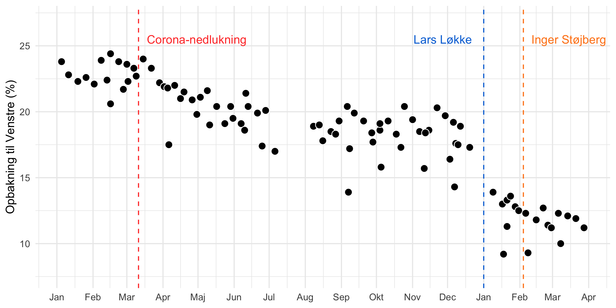 Vi ser flere interessante ting i figuren. For det første ser vi at opbakningen til Venstre løbende falder i løbet af 2020, men ikke fra én måling til den næste. Det er med andre ord et gradvist fald der er sket i løbet af 2020, hvor Socialdemokratiet konsoliderede deres magt og position, herunder også i meningsmålingerne.