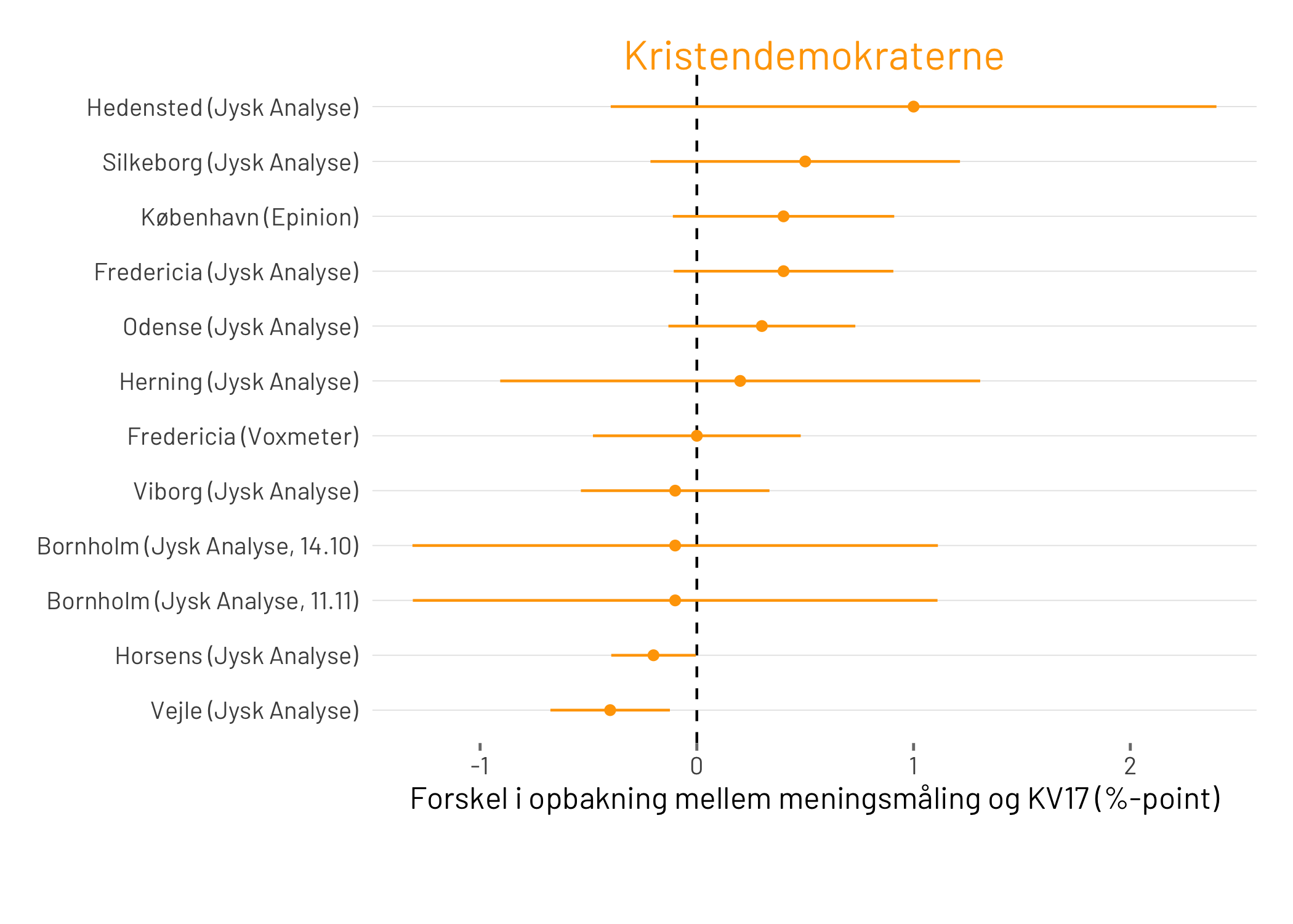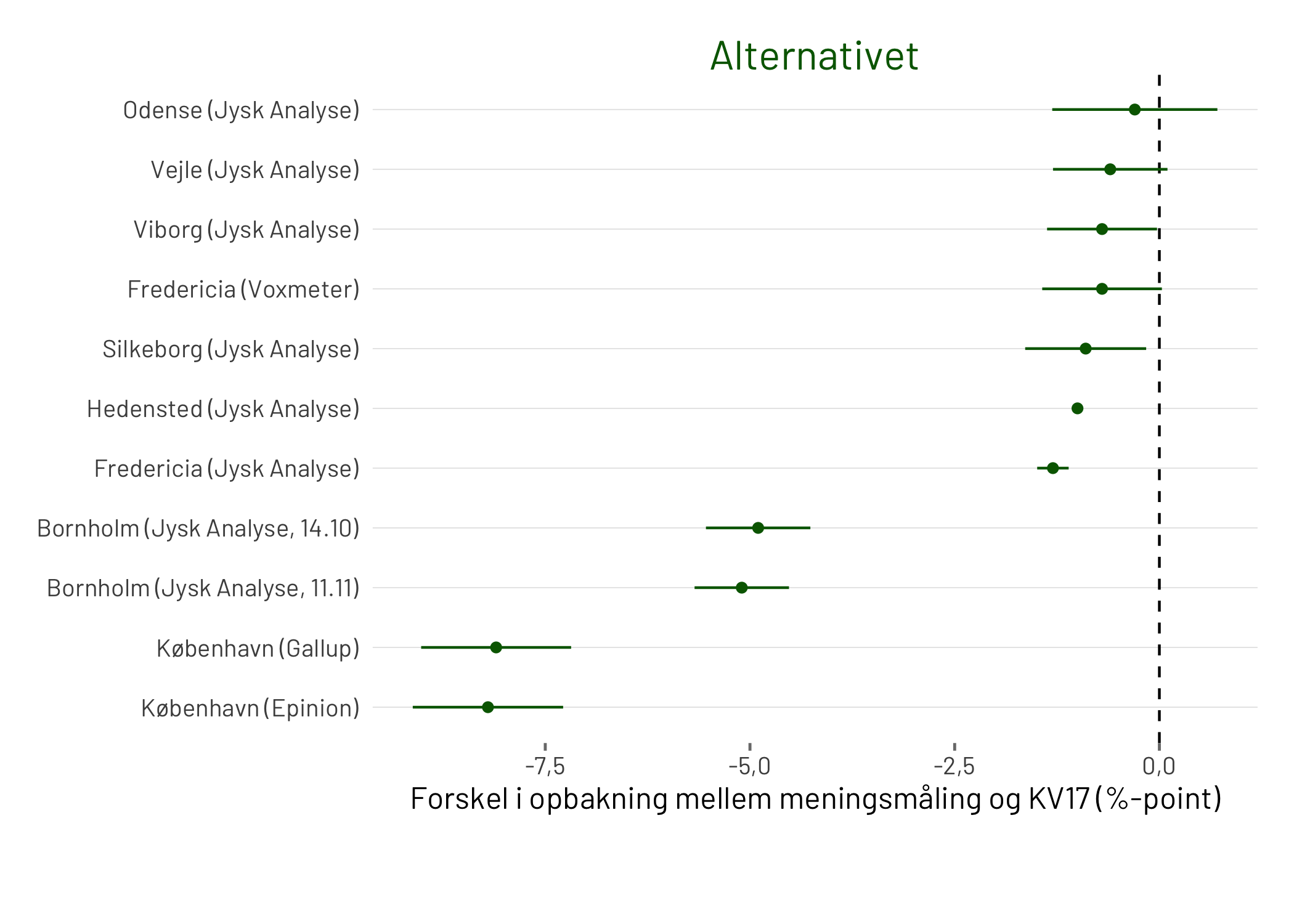 Nedenstående figurer viser forskellen i opbakningen fra kommunalvalget i 2017 til de nyeste meningsmålinger, der er foretaget i perioden fra 1. oktober til 11. november 2021. Positive værdier indikerer øget opbakning fra kommunalvalget 2017 til i dag.
