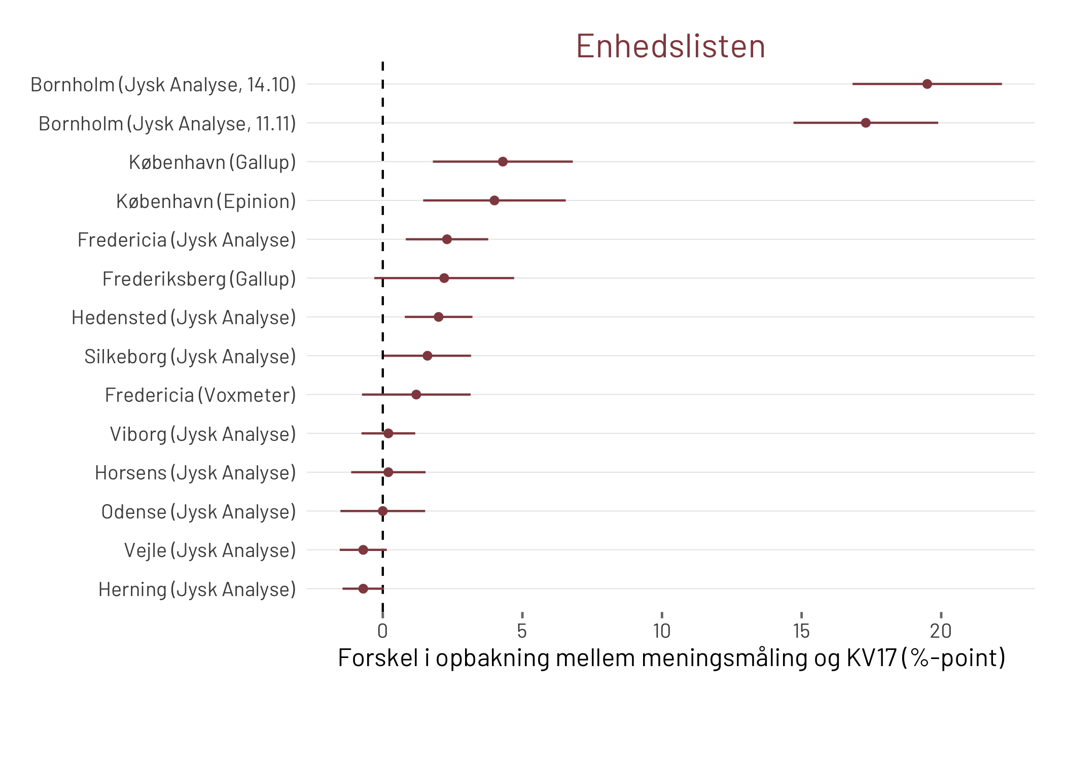 Enhedslisten står til meget stor fremgang i målinger fra Bornholm - og pæn fremgang i København. Bliver ekstra spændende at se, om målingerne rammer plet i disse kommuner.